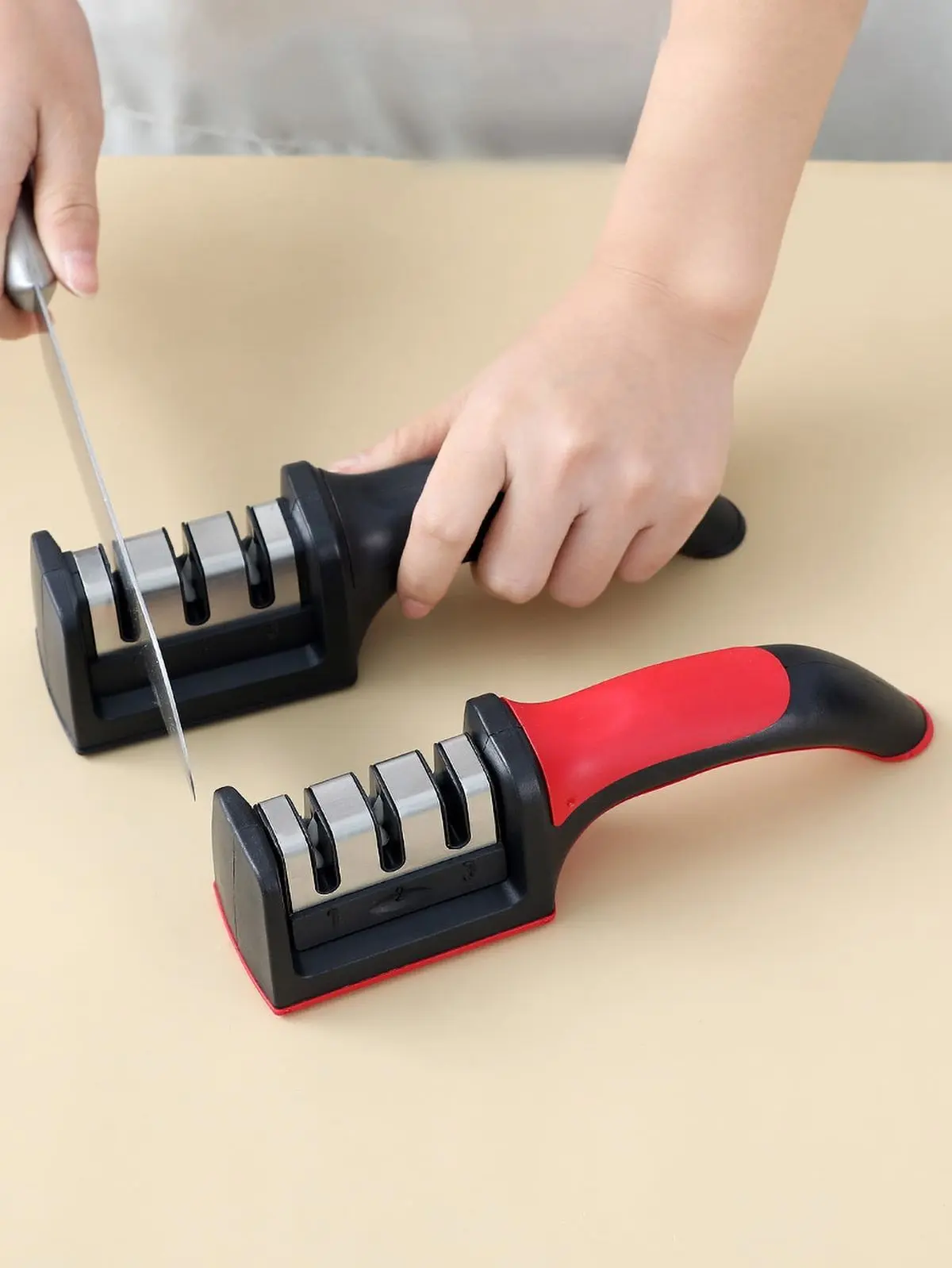 Su mango ergonómico antideslizante y base estable garantizan un uso cómodo y seguro, evitando movimientos bruscos o accidentes durante el afilado. Compacto y ligero, es ideal tanto para uso doméstico como profesional.